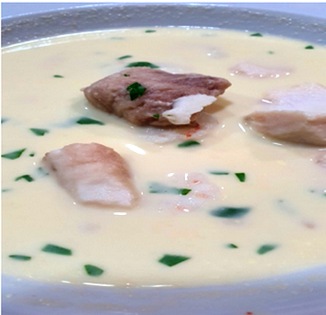 Coger la mayonesa e ir añadiendo al vaso de batir el caldo atemperado, lentamente sin que se corte. Una vez se ha mezclado adecuadamente se añade al resto del caldo con la merluza y gambas moviendo cuidadosamente.