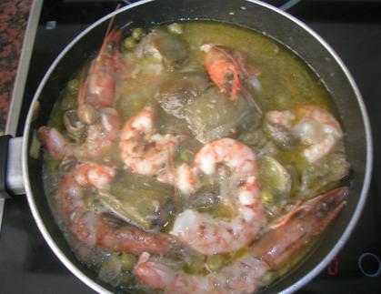Añadir, cuando esté hirviendo, unos Langostinos pelados (respetando cabeza y cola), durante 2-3 minutos. Apartar