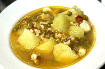 Ponemos en la cacerola con el aceite el puerro, el ajo, pimiento y tomate pelados y picados. Sofreímos con un poco de sal hasta pochar. Añadimos las papas tronchadas y el caldo. Cuando las papas estén tiernas poner el pescado y tras 5 minutos el perejil.