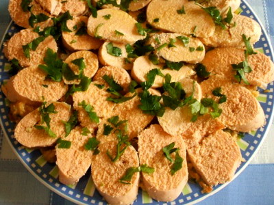 Cocemos las huevas en agua con un puñado de sal (meter las huevas con el agua fría) y reservar. En un dornillo o en cuenco de barro, poner una base de sal y majar primero el ajo, el pimiento y la media cebolla, una vez majados añadir el tomate pelado y seguir majando, después el pan apretado y escurrido con la mano. Terminamos con una cucharadita de vinagre y medio vaso de aceite, poco a poco y removiendo. Cortar las huevas en rodajas y poner encima el perejil.