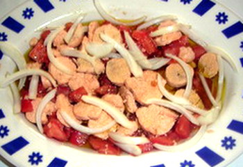 Mientras se enfrian las huevas, picar todas las verduras en cuadrados y una vez frías, cortar las huevas en rodajas, añadirlas a las verdura y aliñar el conjunto con la sal, el aceite y el vinagre.