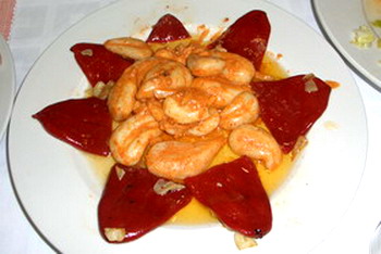 En sartén amplia, confitar (cocción a fuego muy lento) los ajos laminados en aceite de oliva, añadiendo los pimientos a los 10-15 minutos. Mantener otro tiempo similar, añadiéndole la sal. En sartén aparte, con aceite del confitado, agregar los huevos de chocos, limpios y salados, hasta que estén en un punto de consistencia media. Añadir un chorreón de manzanilla antes de apartarlos.