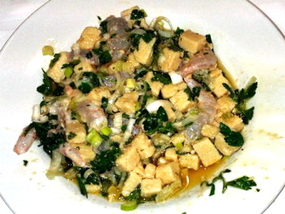 - Mezclar las gambas y los daditos de masa en ensaladera y agregar cebolleta y perejil.