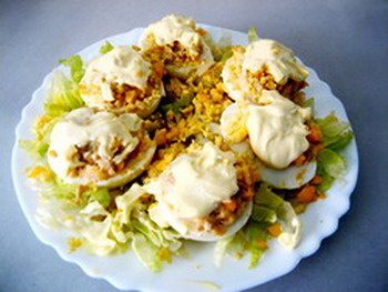 Poner una cama de lechuga a tiras y sobre ella los huevos rellenos.