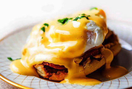 Preparamos primero la salsa, para ello en el vaso de la batidora ponemos un huevo, sal, pimienta negra molida, la cucharada de zumo de limón y vamos añadiendo poco a poco la mitad de la manteca templada (líquida), reservamos. Untamos las rebanadas de pan con la manteca colorá restante y las tostamos ligeramente en una sartén por ambas caras, reservamos. En la misma sartén damos calor a las lonchas de chicharrón. Escalfamos los huevos enteros envueltos en film durante 3 minutos, los retiramos y pasamos a un cazo con agua fría. Cuando tengamos todos los huevos listos montamos el plato. Colocamos la rebanada de pan tostado como base, encima ponemos una o dos lonchas del chicharrón, el huevo escalfado y dos cucharadas de salsa.
