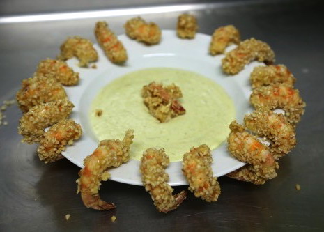 Pelar los langostinos dejando el anillo de la cola, pasarlos por la harina, el huevo batido y las almendras en cubitos, poner en el congelador unos minutos. Freír en abundante aceite de oliva.