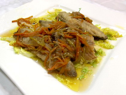 Una vez limpias las caballas las apartamos y nos disponemos a elaborar el escabeche, para lo cual pelamos la zanahoria el puerro y la cebolla y las picamos en juliana. Las ponemos en una cazuela o sartén con el aceite y las sofreímos. Antes de que esté dorada la cebolla, agregamos la pimienta, el laurel, el tomillo, el vino y el vinagre y agua hasta cubrir el conjunto.