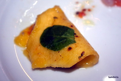 Poner la pasta de chorizo y pasas sobre las láminas de mango y doblar como si fuera una empanadilla.