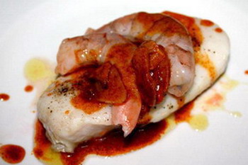 Pedir al pescadero que les limpie, desespine y corte en dos lomos, una merluza o pescadilla. Corte cuatro porciones de lomo de buen tamaño y pele el marisco. Engrase con aceite de oliva una bandeja de horno y coloque en ella los porciones de pescado. Salpimente al gusto, coloque un par de colas de marisco encima de cada porción (el gambón y el carabinero dan buen resultado) y rocíe con un chorreón de aceite. Precaliente el horno a unos 180 grados y meta la bandeja durante 10 o 12 minutos (antes de sacar compruebe que el pescado está hecho).