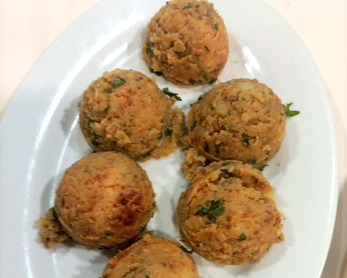 En un plato hondo se pone una bola de las patatas estrujadas y alrededor se colocan dos o tres cucharadas del guiso de mollejas.