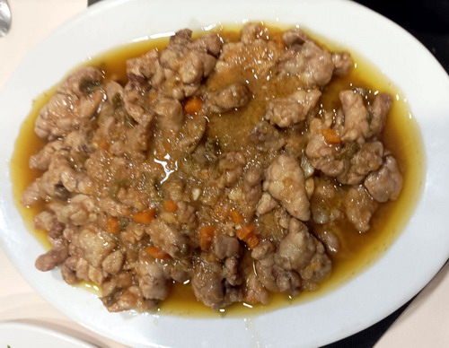 Se pica bien fina la cebolla, el pimiento, la zanahoria, los ajos y el tomate (sin pepitas ni piel) . Los cuatro primeros se ponen a sofreír en una sartén honda con el AOVE y un poco de sal y cuando empiece la cebolla a oscurecerse se echa el tomate, el laurel y el jengibre y se deja sofreír diez minutos más. A continuación se echa el palo cortado y se dejan transcurrir dos o tres minutos para que se evapore el alcohol. A continuación se echan las mollejas, una vez escurridas, y se añade una cucharadita de postre de pimentón agridulce. Se echa más sal y se deja cocer hasta que se forme el caldo con el líquido soltado por las mollejas. El guiso estará terminado cuando ese caldo se haya reducido a la mitad (las mollejas no deben “nadar” en él), un par de minutos antes de apagar el fuego, se rectifica de sal.