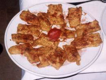 Cortar la masa fina en cuadritos, rebozarlos en harina y huevo y freir en abundante aceite hirviendo.