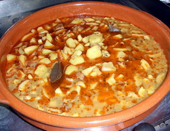 Se hace un refrito con la cebolla y los ajo, una vez dorados estos se le incorpora el choco cortado en trozos, se rehoga y se sala. A continuación se le añade el medio vaso de vino, se deja reducir un poco y se le añade el pimentón, el orégano, la hojita de laurel y la A. Cesárea, se vuelve a rehogar y a continuación se le añade las papas cortadas a trozos, se cubre de agua y se introduce en la olla exprés (todos los pasos anteriores se pueden hacer en la misma olla), unos 10 o 15 minutos. Al final y cuando se destape la olla se le añade el Boletus E. y por último se le da un pequeño hervor para que coja el sabor de las setas.