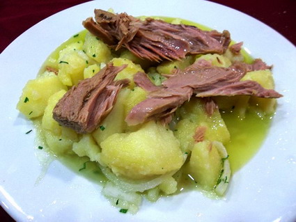 Hervir las patatas con piel. Una vez hervidas, pelarlas y tronzarlas en trozos no muy grandes. Añadir la cebolla cortada muy fina. Incorporar el atún bien escurrido. Aliñar con abundante aceite de oliva y sal y vinagre al gusto y mezclar bien. Por último adornar con un poco de perejil picado por encima.