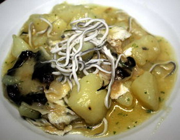 Poner en una olla el aceite a fuego mínimo los ajos picados y la guindilla sin cortar, cuando empiece a dorar agregar las cocochas e ir moviendo hasta que suelte parte de su gelatina (unos 10 minutos). Sacar las cocochas y reservar. Poner en el aceite gelatinoso anterior la cebolla y cuando se poche (blanditas y transparentes) las patatas tronchadas, subir el fuego a media potencia y reogar un poco las patatas. Poner el caldo hasta cubrir. Cuando estén blandas las patatas, agregar las cocochas y la mitad de las gulas para que calienten un par de minutos. En el plato se ponen adornando en el centro unas gulas y un poco de perejil picado.