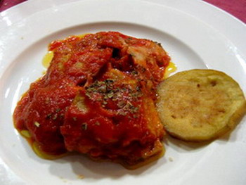 En un molde de horno, con suficiente altura, se pone una capa de berenjenas fritas, encima una capa del queso rayado, sobre esta una de tomate y otra de orégano al gusto. Se repite esta operación dos veces (o mas dependiendo de las dimensiones del molde) y se mete en el horno, previamente calentado a 180 º durante 15 minutos.