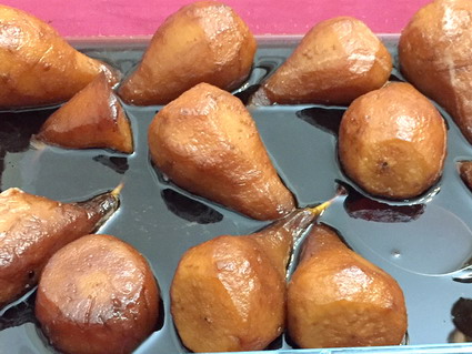 5. Colocamos las peras en un plato, bol o bandeja de presentación, regamos con el vino (colado previamente) y servimos.