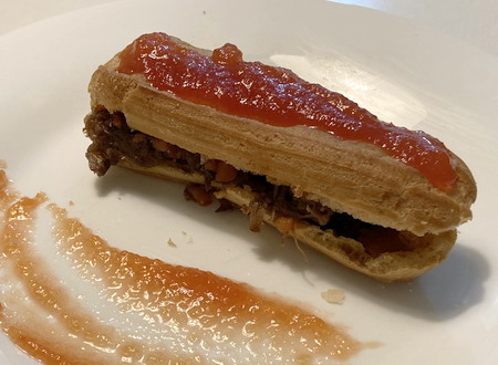 Normalmente el petisú o palo eclair se elabora como un dulce relleno de crema o chocolate. En este caso presentamos un petisú salado relleno de carrilera con una