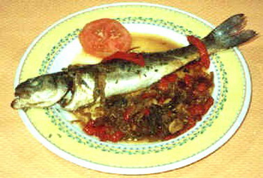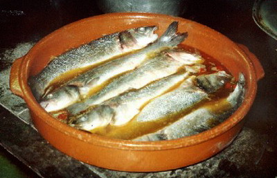 En una sartén o en cazuela de barro, preparamos la juliana con la verdura cortada a tiras en un fondo de aceite y una pizca de sal. Cuando comience a dorar, comprobamos de sal, añadimos la pizca de pimienta y colocamos el pescado encima Cocemos a fuego lento 5 minutos con la piel hacia arriba y 10 minutos hacia abajo.