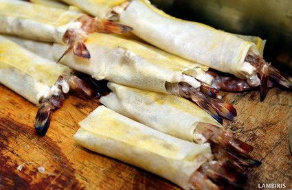 Una vez realizada esta operación con todos los langostinos, cortamos las obleas por la mitad, colocamos un langostino encima, ponemos una porción de pasta de relleno en él y colocamos otro langostino encima como si fuera un bocadillo. Enrollamos el "bocadillo" con la oblea y la cerramos untando el final con yema de huevo. Lo mismo para todos los langostinos. Reservamos.