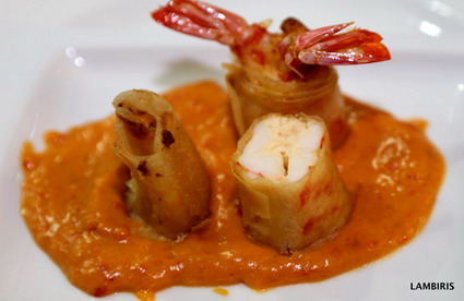 ROLLITOS DE LANGOSTINOS SOBRE CREMA DE PIQUILLOS