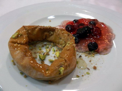 Mezclar el azúcar, la canela y los frutos secos picados, extender cada hoja de pasta filo (una por persona), con una brocha extender un poco de mantequilla derretida y poner un poco de la mezcla muy extendida en una línea, enrollar la pasta y después de dos vueltas poner otra línea muy fina de mezcla, terminar de enrollar y con cuidado formar un rosco uniendo los extremos con un poco de agua (debe quedar en el centro un círculo de 6 o 7 cm de diámetro). Hornear a 180 grados hasta dejar dorado, pintar con miel, espolvorear con pistacho picado.