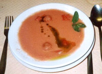 Se trocea la sandía (solo la parte más roja) y se limpia de pepitas, se reservan unos daditos para que nos sirvan como tropezones. Se lavan y pelan los tomates grandes. Se trituran con la batidora los tomates y la sandía, se pasan por el pasapurés y se meten en el frigorífico. A los tomatitos enanos les hacemos un corte pequeño y los metemos en agua hirviendo unos segundos para pelarlos. Ponemos el aceite, un poco de sal, la pimienta y cuatro o cinco hojas de hierbabuena en la batidora, para conseguir un aceite aromático. Se sirve la sopa con los tropezones de sandía, los tomates enanos, un buen chorreón del aceite y adornada con una ramita de hierbabuena.