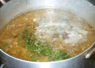 Hacemos un refrito con el diente de ajo y las cebollas cortadas muy finas en un fondo de aceite de oliva. Cuando comienza a dorar le añadimos perejil picado y el caldo de las galeras, dejando hervir el conjunto 10 minutos.