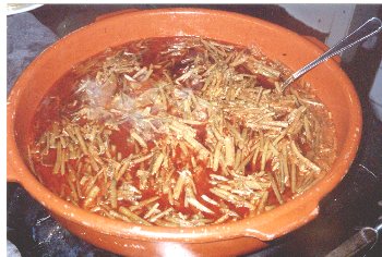 En cazuela, disponer las tagarninas agregando agua hirviendo y el majado.