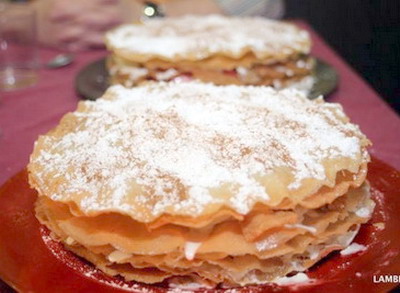 Separar una de las hojas de pasta brick, (importante poner un paño húmedo y escurrido encima del resto, cuando estamos en la fritura de la anterior, se secan con facilidad) y freír en aceite bien caliente, escurrir sobre papel absorbente. Una vez frías, poner dos hojas, relleno de nueces fresas y nata, una hoja, más relleno y así hasta las dos últimas hojas sin relleno finales. Espolvorear con azúcar glas y un poco de canela.