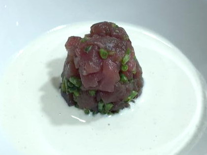 Para el tartar de atún: picar el atún o cortar en pequeños dados y salar un poco con la sal negara. Picar la salicornia y reservar.