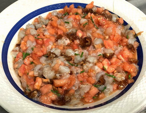 Pelar y trocear los langostinos (reservar cabezas y cáscaras para otras recetas). Pelar y trocear los tomates con tamaño aproximado a los langostinos y unir a estos. Añadir la salicornia picada, el Garum, sal, pimienta y remover.