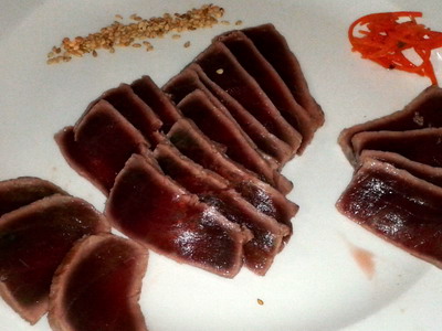 Cortar el atún en trozos de 5 por 3 por 10 cm o más. Planchear en una sartén bien caliente con un poco de aceite, unos 20 segundos por lado. Lo más rápido posible pasar por agua con hielo. Servir en el plato el atún fileteado con un poco de pimienta y unos granos de sésamo. A su lado en un platito pequeño, poner el garum para mojar