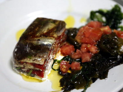 TERRINA DE BOQUERONES Y PIMIENTOS DEL PIQUILLO CON ENSALADA DE ALGAS