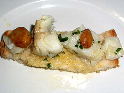 Sobre una rodaja de pan tipo chapata, poner un trozo de bacalao y decorar con los ajos fritos,