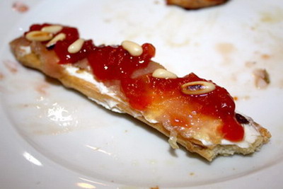 Preparar una crema de queso pasando por la picadora el queso payoyo y el queso filadelphia. Tostar ligeramente el pan, colocar encima la crema de queso, las lonchitas de mojama, un poco de mermelada de tomate y unos piñones.