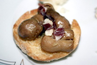 Saltear en sartén las setas con el aceite, ajos, sal y la pimienta. Picar fino las lonchitas de jamón. Poner en el medio mollete las setas, encima un buen puñado de la picada de jamón. Al horno precalentado a 200 grados durante 5 minutos, cuando estén en el plato de servir poner el huevo el huevo (frito, a la plancha, escalfado o crudo sin la clara).En la foto falta el huevo.