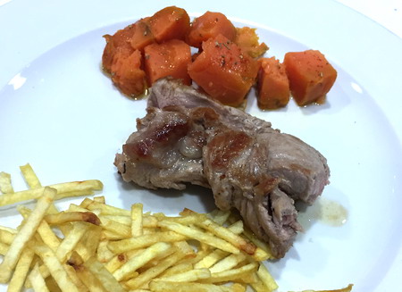 A un lado poner el boniato troceado y especiado, añadiendo un poco de aceite virgen extra encima. En el centro la trenza. Y al otro lado las patatas paja.