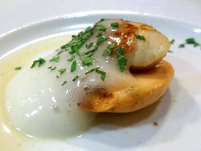 En un plato llano depositar una vieira en un lateral. Echar la espuma de flor de garum por encima, dejando a la vista la mitad de la vieira. En el otro lado del plato se puede poner un poco de ensalada variada de hojas o unas verduras cortadas en bastón a la plancha.